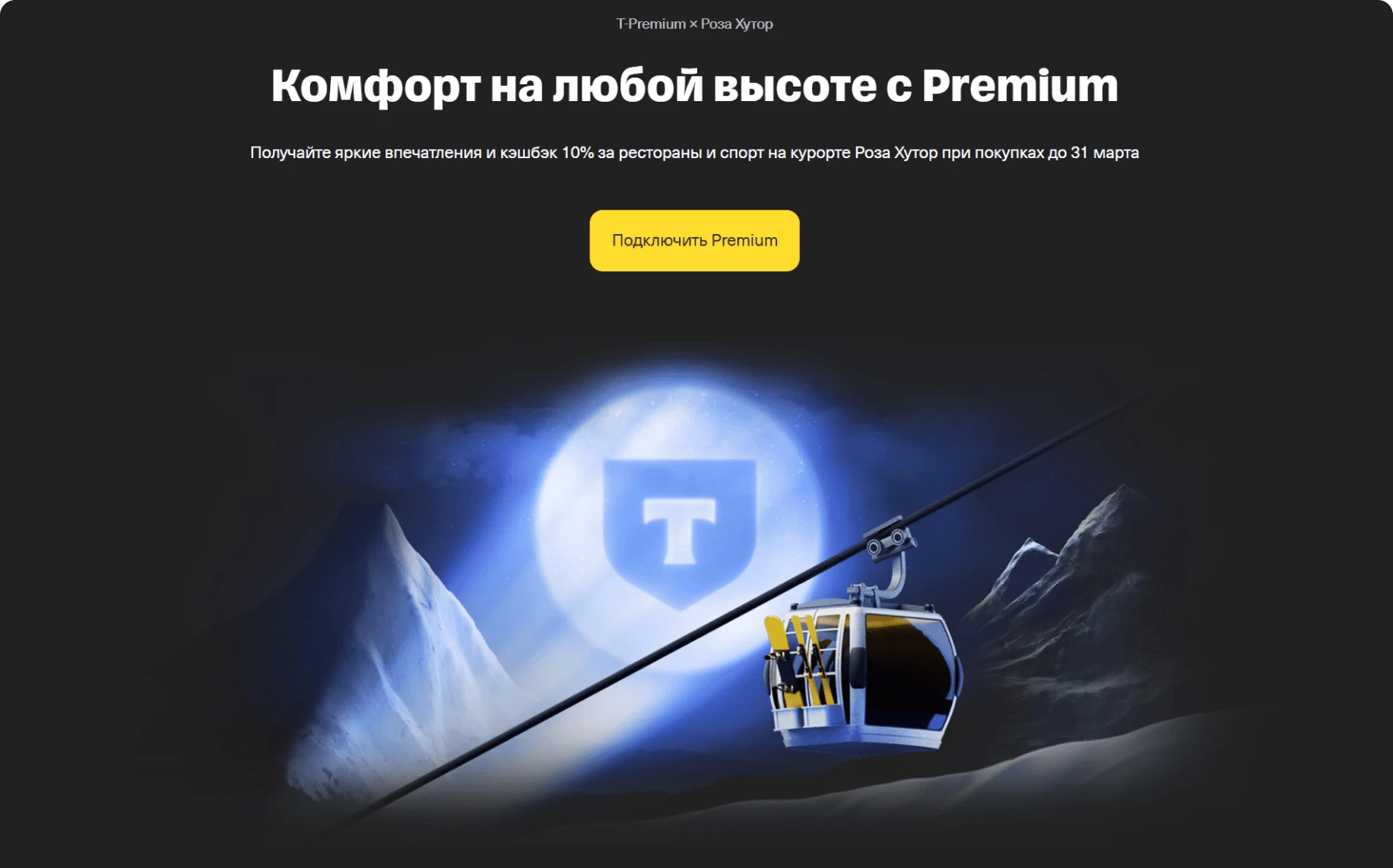 Задача: реализация предложения от Т-Банка воспользоваться привелегиями сервиса T-Premium и T-Private на россйиском горнолыжном куороте «Роза Хутор» в Сочи.