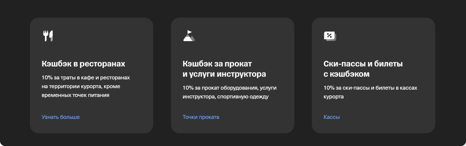 Ролик построен на визуализации предложений с 10% кэшбэком за: траты в кафе и ресторанах на территории курорта, прокат оборудования, услуги инструктора, спортивную одежду и ски-пассы и билеты в кассах курорта.
